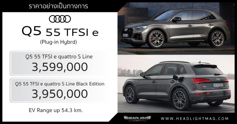 ราคาอย่างเป็นทางการ Audi Q5 55 TFSI e (Plug-in Hybrid) … อ่านเพิ่มเติม ราคาอย่างเป็นทางการ Audi Q5 55 TFSI e (Plug-in Hybrid) : 3,599,000 – 3,950,000 บาท | วิ่งด้วยไฟฟ้าได้ 54.3 km.