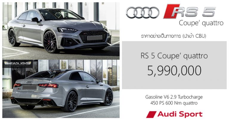 Audi RS 5 Coupe’ ราคาอย่างเป็นทางการ (นำเข้า CBU) … อ่านเพิ่มเติม ราคาอย่างเป็นทางการ Audi RS 5 Coupe’ : 5,990,000 บาท (นำเข้า CBU) เบนซิน V6 2.9 Turbo 450 แรงม้า ขับ4