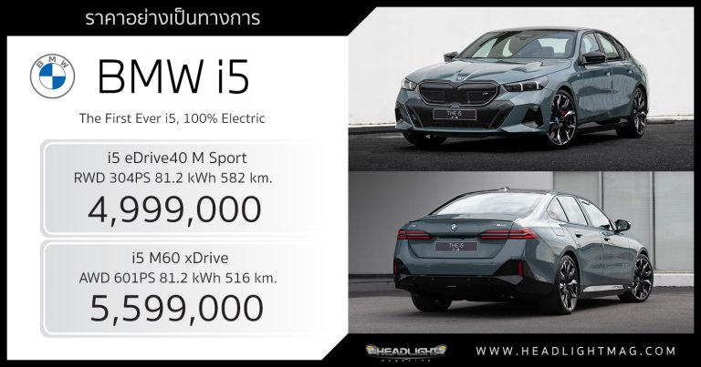 ราคาอย่างเป็นทางการ BMW i5 (G60) i5 eDrive40 M Sport : … อ่านเพิ่มเติม ราคาอย่างเป็นทางการ BMW i5 : 4,999,000 – 5,599,000 บาท | ขุมพลังไฟฟ้า 340 – 601 แรงม้า วิ่งไกลสุด 582 km. (WLTP)