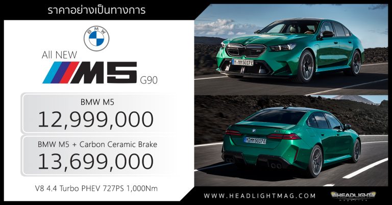 ราคาอย่างเป็นทางการ All NEW BMW M5 (G90) BMW M5 : 12,99 … อ่านเพิ่มเติม ราคาอย่างเป็นทางการ All NEW BMW M5 (G90) : 12,999,000 – 13,699,000 บาท | เบนซิน V8 4.4L Turbo PHEV 728 แรงม้า