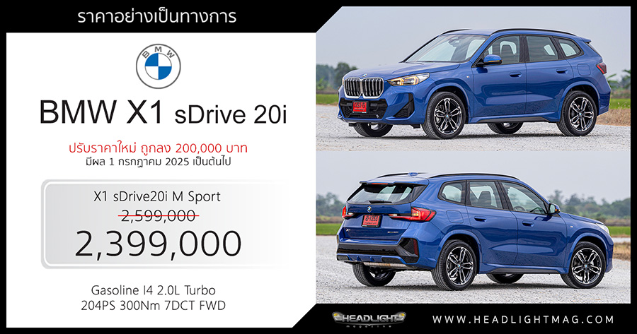 BMW Group ประเทศไทย ประกาศปรับราคารถยนต์ในกลุ่ม Compact Class โดยมีผลตั้งแต่วันที่ 1 กรกฎาคม 2025 เป็นต้นไป สำหรับ BMW X1 มีการปรับราคารุ่น sDrive 20i M Sport จาก 2,599,000 บาท เหลือ 2,399,000 บาท ถูกลง 200,000 บาท พร้อมยกเลิกการจำหน่ายรุ่น sDrive 20i x Line และรุ่น xDrive 30e M Sport อย่างเป็นทางการ