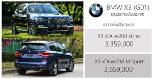 ราคาอย่างเป็นทางการ BMW X3 xDrive20d (G01 : รุ่นประกอบในประเทศ) : 3,359,000 – 3,659,000 บาท