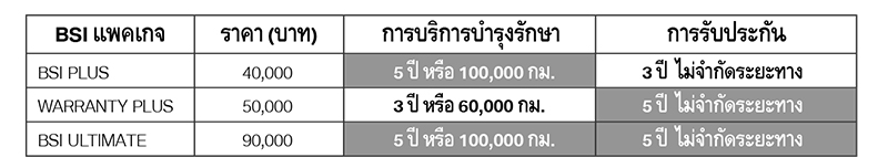 - BSI Plus : เพิ่ม BSI ฟรีค่าบำรุงรักษาเป็น 5 ปี หรือ 100,000 กิโลเมตร + 40,000 บาท