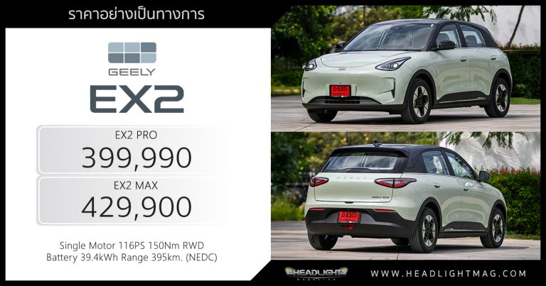 ราคาอย่างเป็นทางการ + เทียบสเป็ค GEELY EX2 : 399,990 – 429,990 บาท | วิ่งไกลสุด 395 km. (NEDC)