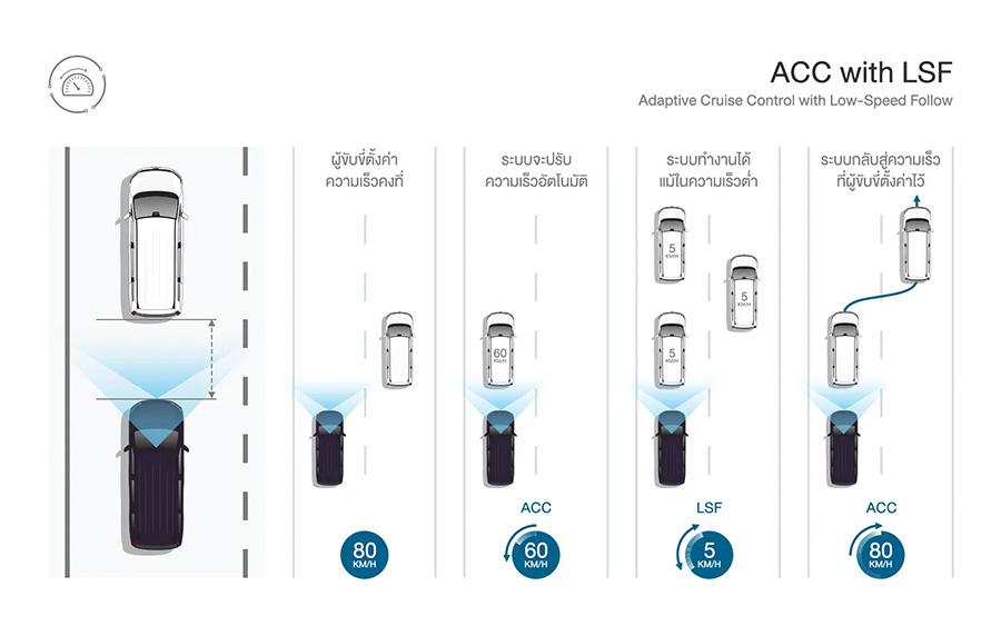 • ระบบควบคุมความเร็วอัตโนมัติแบบแปรผัน พร้อมปรับความเร็วตามคันหน้า Adaptive Cruise Control ACC with LSF Low Speed Following