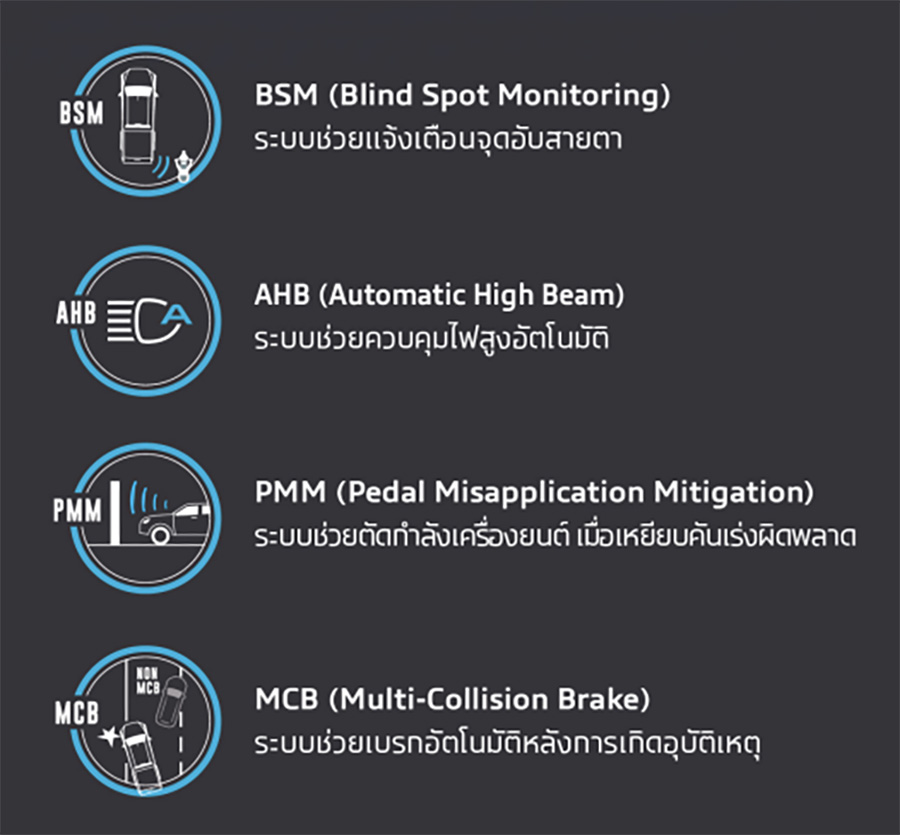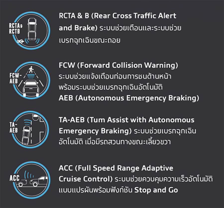 - ระบบเบรกฉุกเฉินอัตโนมัติเมื่อมีรถสวนทางขณะเลี้ยวขวา TA-AEB