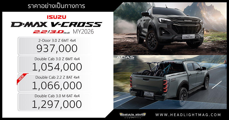 ราคาอย่างเป็นทางการ Isuzu D-Max V-Cross MY2026 : 937,000 – 1,297,000 บาท | เพิ่มรุ่น 2.2 Z 8AT 4×4