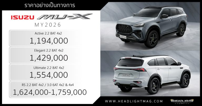 ราคาอย่างเป็นทางการ Isuzu MU-X MY2026 MU-X 2.2 Active … อ่านเพิ่มเติม ราคาอย่างเป็นทางการ Isuzu MU-X MY2026 : 1,194,000 – 1,759,000 บาท | เพิ่ม ADAS รุ่นเริ่มต้น ช่วงล่าง STIFF FLEX