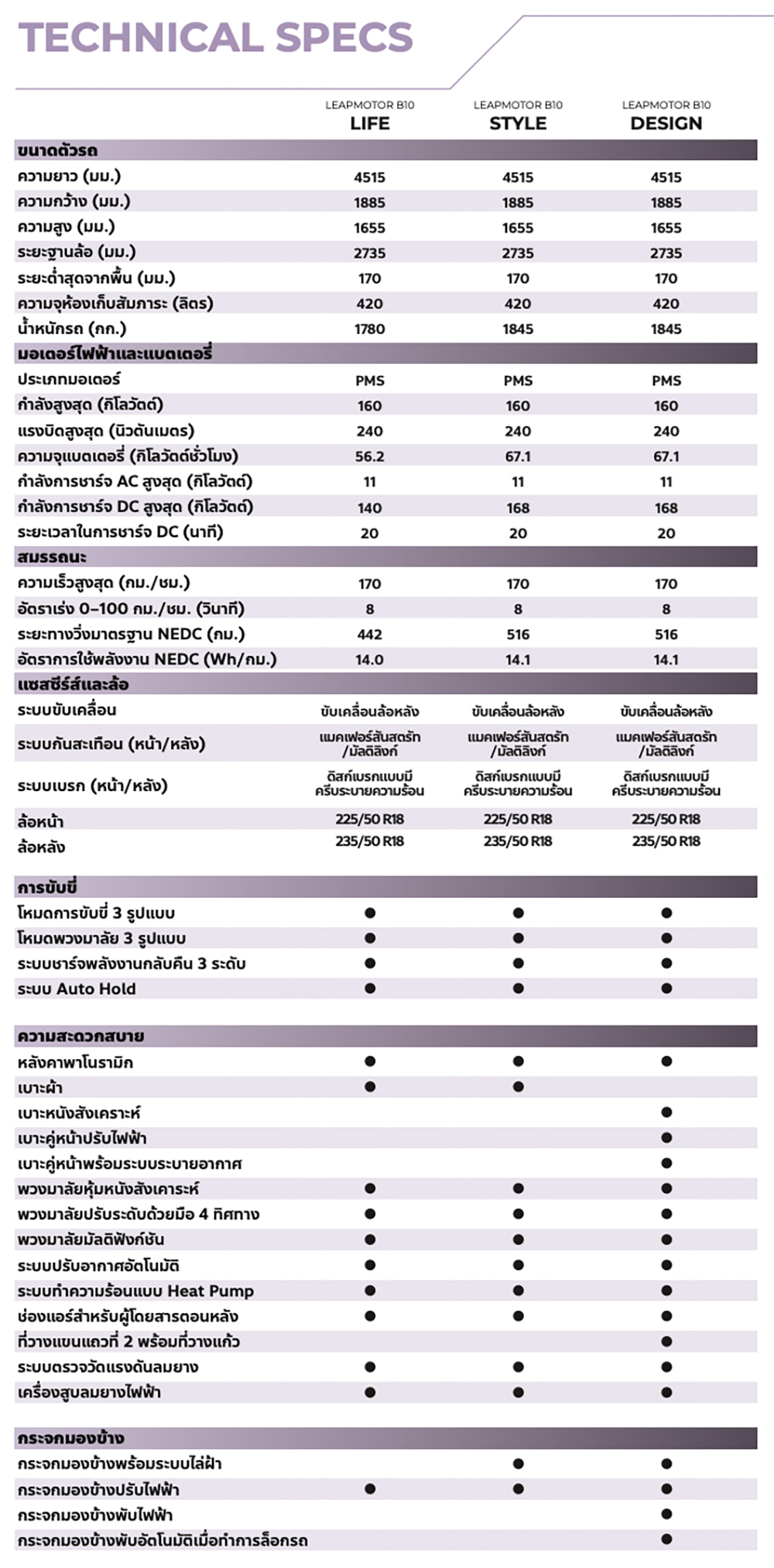 - LeapMotor B10 : 4,515 x 1,873 x 1,625 / 2,735 มิลลิเมตร