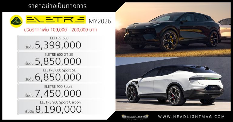 ราคาอย่างเป็นทางการ Lotus ELETRE (MY2026) : เริ่มต้น 5,290,000 บาท | ปรับเพิ่ม 109,000 – 200,000 บาท