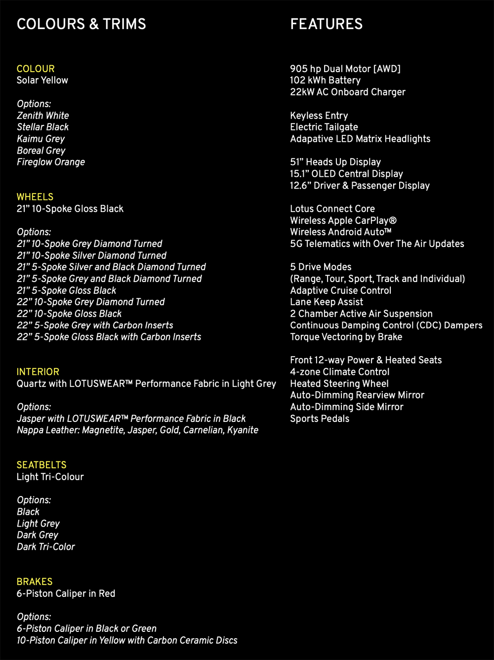 ขับเคลื่อน 4 ล้อ AWD ด้วยมอเตอร์ไฟฟ้า กำลังสูงสุด 905 แรงม้า (HP) แรงบิดสูงสุด 985 นิวตันเมตร ติดตั้งแบตเตอรี่ Lithium Ion Polymer ความจุ 112 kW รองรับการชาร์จด้วยไฟฟ้ากระแสสลับ AC สูงสุด 22 kW และรองรับการชาร์จด้วยไฟฟ้ากระแสตรง DC สูงสุด 355 kW พร้อมฝาปิดช่องชาร์จไฟระบบสัมผัส Touch Activated Electric Charging Port Cover