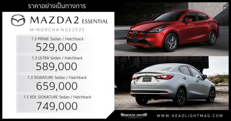 ราคาอย่างเป็นทางการ + เทียบสเป็ค Mazda 2 ESSENTIAL (Minorchange 2025) : 529,000 – 749,000 บาท