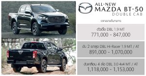 All NEW Mazda BT-50 ราคาอย่างเป็นทางการ Double Cab 4 ปร … อ่านเพิ่มเติม ราคาอย่างเป็นทางการ All NEW Mazda BT-50 Double Cab (ดีเซล 1.9 / 3.0) : 771,000 – 1,153,000 บาท