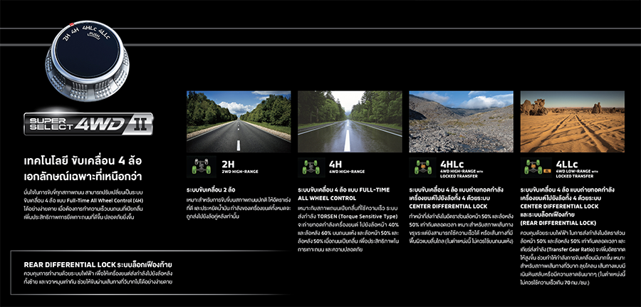ในรุ่นขับเคลื่อน 4 ล้อ Super Select 4WD II มีโหมดการขับขี่ มีให้เลือก 7 รูปแบบ ได้แก่