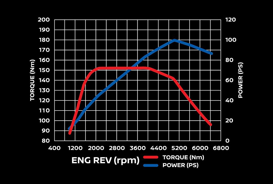 เครื่องยนต์รหัส HRA0 เบนซิน 3 สูบ DOHC 12 วาล์ว ขนาด 1.0 ลิตร 999 ซีซี. กระบอกสูบ x ระยะช่วงชัก : 72.2 x 81.3 มิลลิเมตร กำลังอัด 9.5 : 1 พ่วงระบบอัดอากาศ Turbocharger พร้อม Intercooler กำลังสูงสุด 100 แรงม้า (PS) ที่ 5,000 รอบ/นาที แรงบิดสูงสุด 152 นิวตันเมตร ที่ 2,400 – 4,000 รอบ/นาที จับคู่กับเกียร์อัตโนมัติ XTronicCVT พร้อม D-Step Logic ขับเคลื่อนล้อหน้า รองรับน้ำมันสูงสุด Gasohol E20 ความจุถังน้ำมัน 35 ลิตร