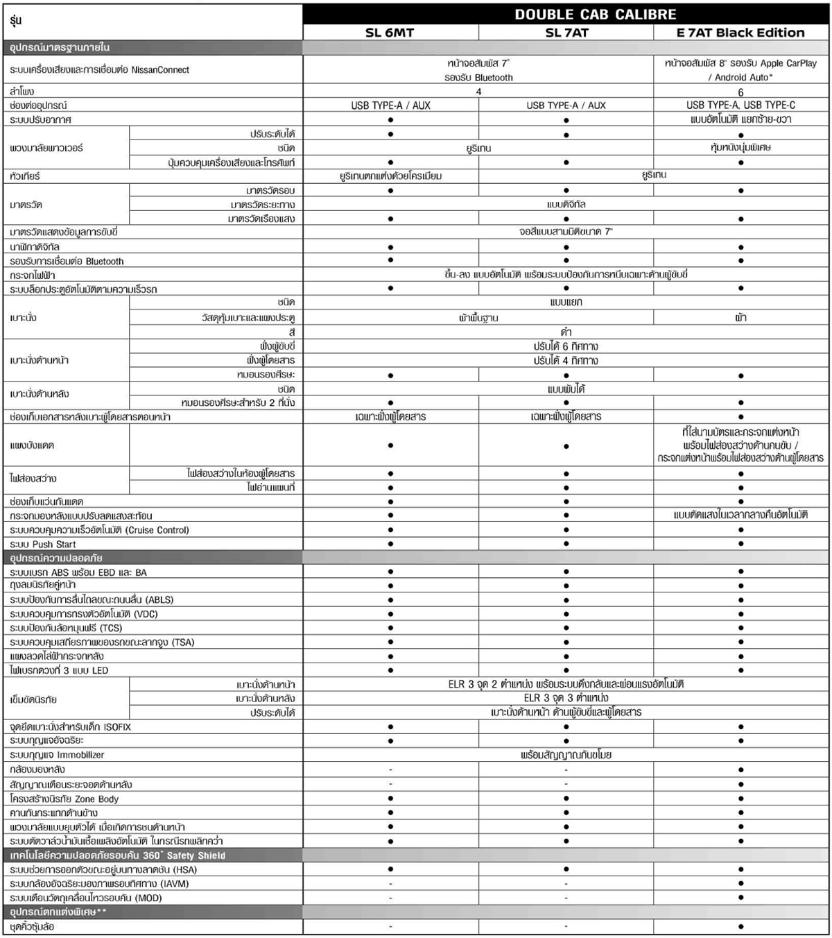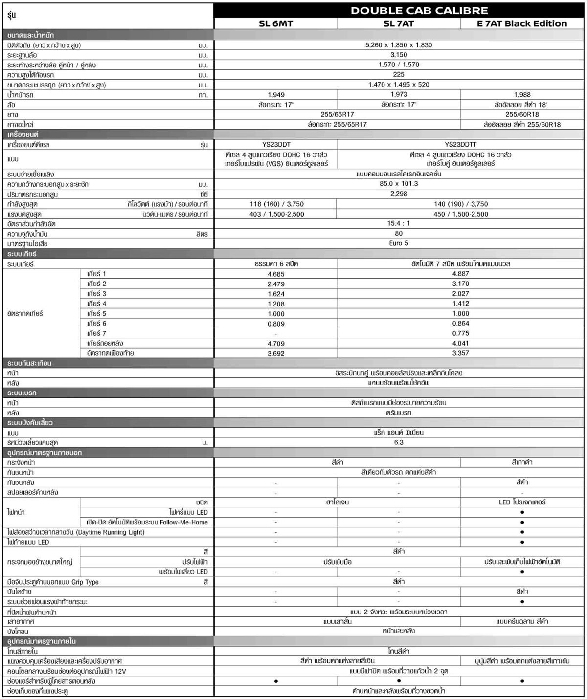 ตารางสเป็คและอุปกรณ์ เทียบกับรุ่น Double Cab Calibre E Black Edition