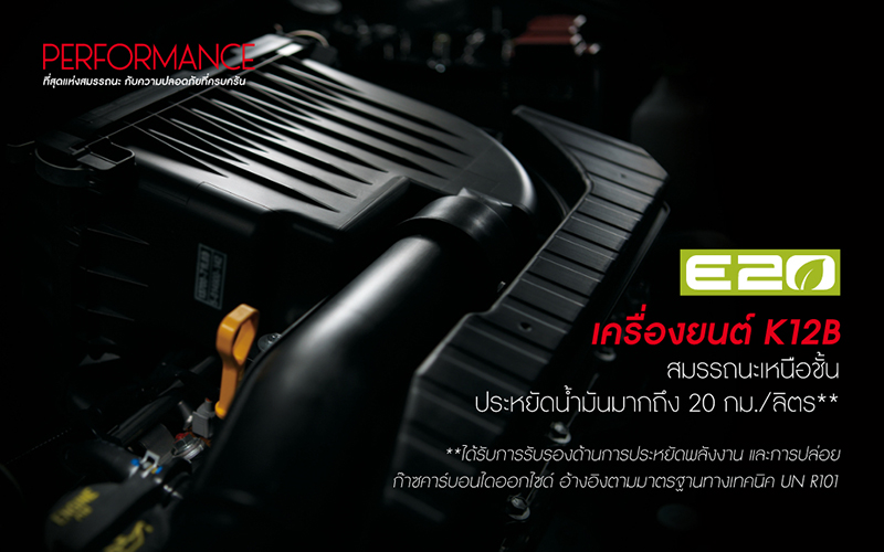 เครื่องยนต์เบนซิน รหัส K12B 4 สูบ 16 วาล์ว ระบบวาล์วแปรผัน VVT ขนาด 1.25 ลิตร 1,242 ซีซี. กระบอกสูบ x ระยะช่วงชัก : 73.0 x 74.2 มิลลิเมตร อัตราส่วนกำลังอัด 11.0 : 1 พละกำลังสูงสุด 91 แรงม้า ที่ 6,000 รอบ/นาที แรงบิดสูงสุด 118 นิวตันเมตร ที่ 4,800 รอบ/นาที จับคู่กับเกียร์อัตโนมัติ CVT รองรับน้ำมันสูงสุด E20