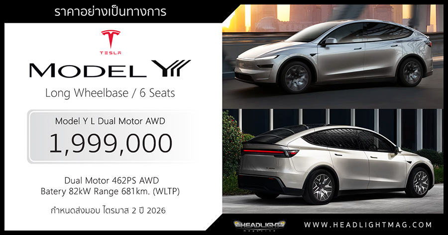 ราคาอย่างเป็นทางการ TESLA MODEL Y L : เริ่มต้น 1,999,000 บาท | ฐานล้อยาว เบาะ 3 แถว 6 ที่นั่ง