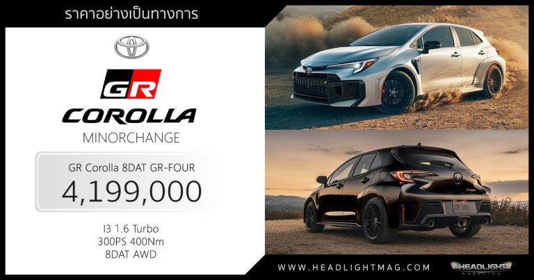 ราคาอย่างเป็นทางการ Toyota GR Corolla Minorchange GR Co … อ่านเพิ่มเติม ราคาอย่างเป็นทางการ Toyota GR Corolla Minorchange : 4,199,000 บาท | เบนซิน 1.6L Turbo 300 แรงม้า เกียร์อัตโนมัติ 8DAT