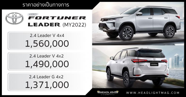 ราคาอย่างเป็นทางการ Toyota Fortuner Leader (MY 2022) : 1,371,000 – 1,560,000 บาท