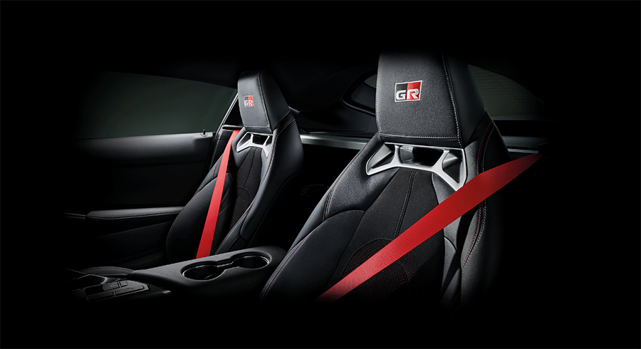 - ภายในห้องโดยสาร ตกแต่งโลโก้ GR ที่พนักพิงศีรษะ พร้อมเข็มขัดนิรภัยสีแดง