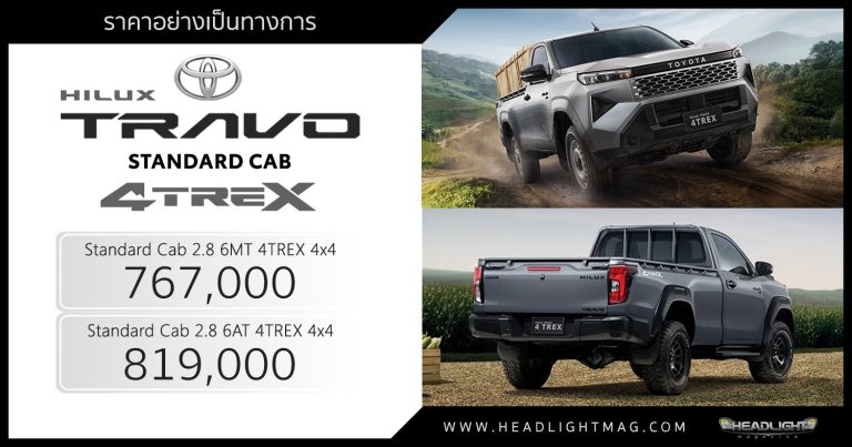 ราคาอย่างเป็นทางการ Toyota Hilux TRAVO Standard Cab : 767,000 – 819,000 บาท | หัวเดี่ยว ยกสูง 4×4