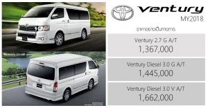 ราคาอย่างเป็นทางการ Toyota Ventury (MY2018) เบนซิน 2.7 / ดีเซล 3.0 : 1,367,000 – 1,662,000 บาท