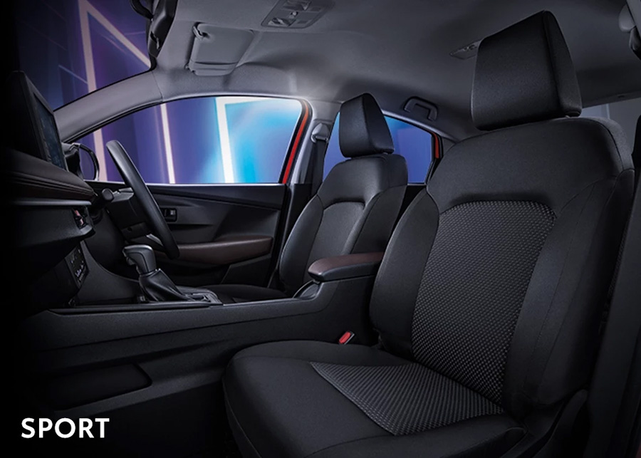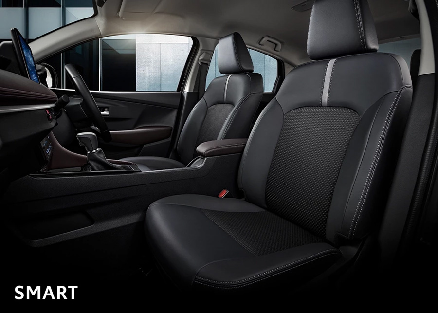 - เบาะนั่งหุ้มด้วยหนังสังเคราะห์และผ้า ตกแต่งด้วยด้ายสีเทา