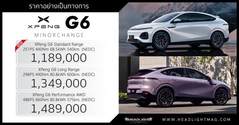 ราคาอย่างเป็นทางการ XPeng G6 Minorchange Xpeng G6 Stand … อ่านเพิ่มเติม ราคาอย่างเป็นทางการ XPeng G6 Minorchange : 1,189,000 – 1,489,000 บาท | เพิ่มรุ่น Standard Range แบตฯ 68.5 kWh