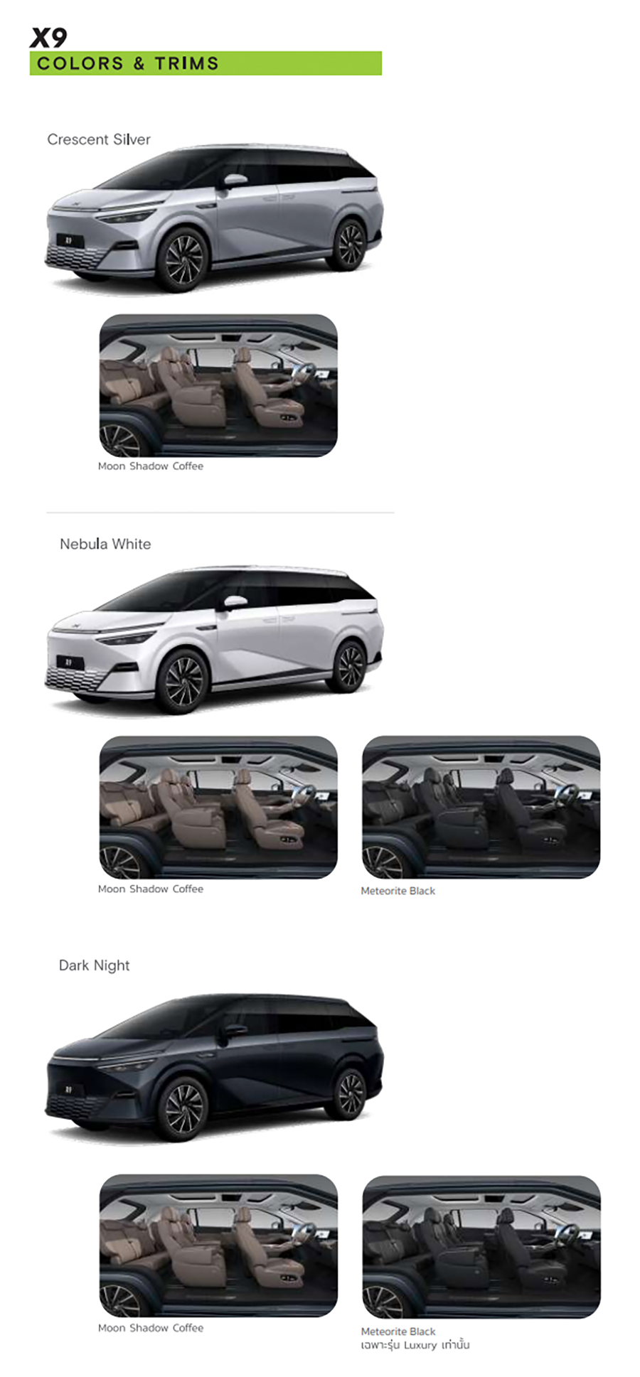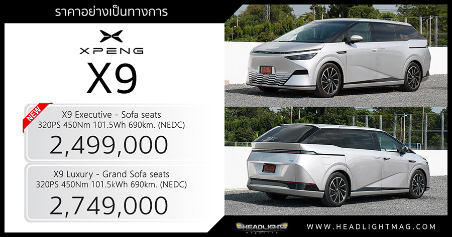 XPeng X9 Premium : 2,399,000 บาท(ยกเลิกทำตลาด)- XPeng X9 Executive : 2,499,000 บาท (NEW)