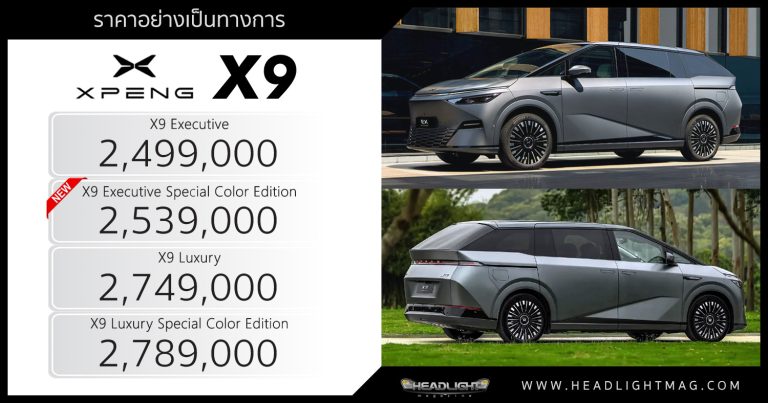 ราคาอย่างเป็นทางการ Xpeng X9 (MY2026) Xpeng X9 Executiv … อ่านเพิ่มเติม ราคาอย่างเป็นทางการ Xpeng X9 (MY2026) : 2,499,000 – 2,789,000 บาท | เพิ่มรุ่น Special Color Edition