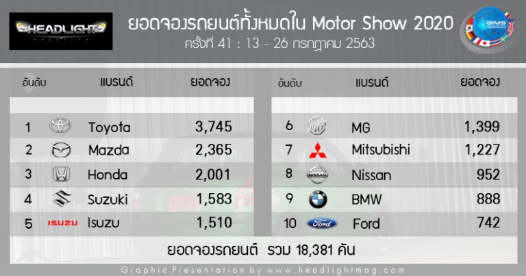 สรุปยอดจองรถยนต์ทั้งหมดในงาน Motor Show 2020 (13 – 26 ก.ค. 63) รวม 18,381 คัน ลดลง 51.3%