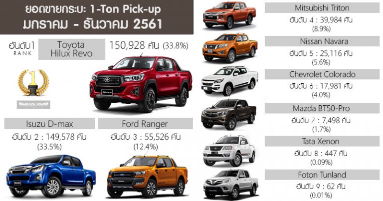 Sales Report : ยอดขายกระบะ Pick-up ปี 2018 / 2561 : Toyota Hilux Revo ครองแชมป์อันดับ 1