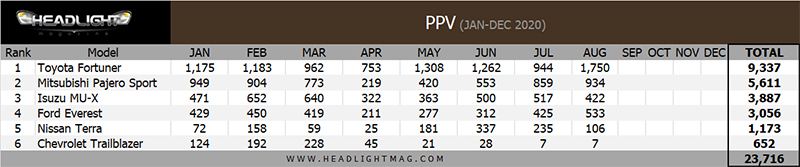 ยอดขายรวม PPV (SUV พื้นฐานกระบะ) เดือน มกราคม – สิงหาคม 2020 รวม 23,716 คัน