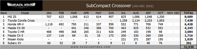 ยอดขายรวมรถกลุ่ม SubCompact Crossover เดือน มกราคม – ตุลาคม 2020 รวม 32,930 คัน