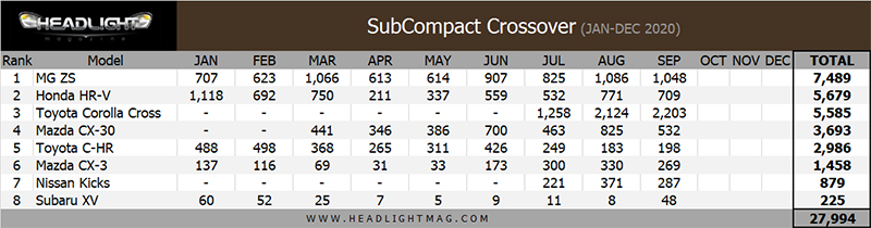 ยอดขายรวมรถกลุ่ม SubCompact Crossover เดือน มกราคม – กันยายน 2020 รวม 27,994 คัน