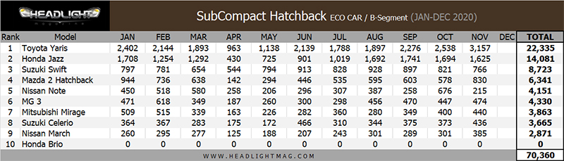 ยอดขายรวมรถกลุ่ม SubCompact Hatchback (ECO/B-Seg) เดือน มกราคม – พฤศจิกายน 2020 รวม 70,360 คัน