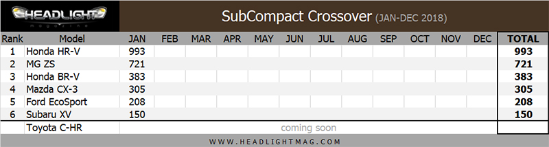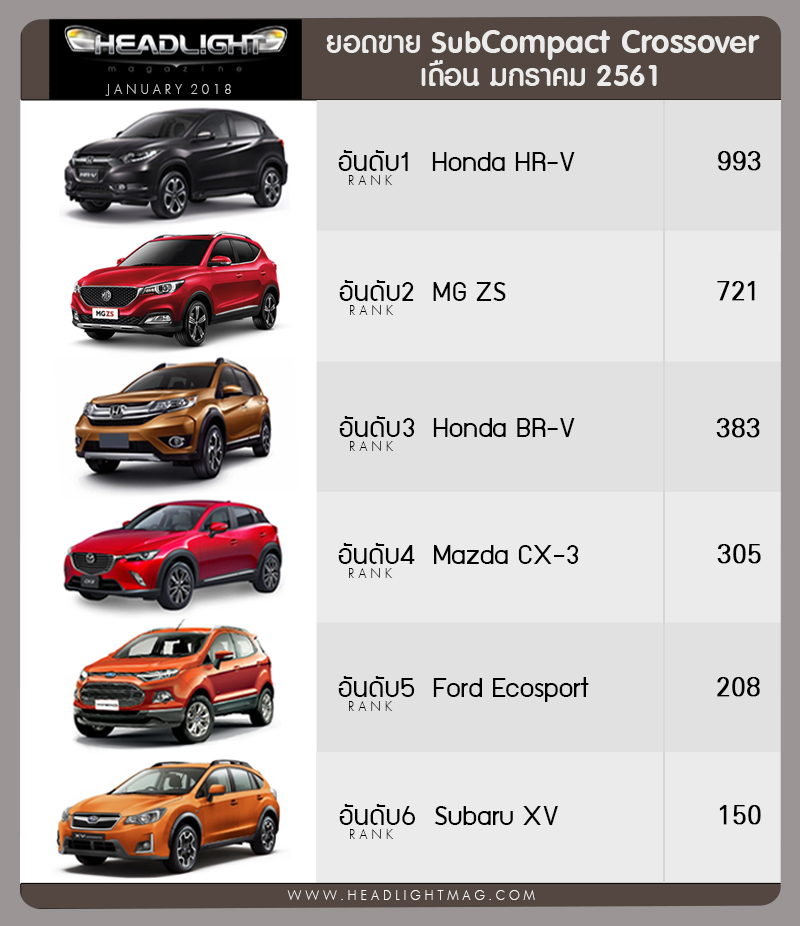 เปิดต้นปี 2018 มา เดือนแรก มกราคม MG ZS ที่ยังคงมียอด Back Order ค้างส่งมอบตั้งแต่เปิดตัวเมื่อเดือน พฤศจิกายน 2017 ทำให้เดือนนี้ ยอดขายไล่บี้อันดับ 1 อย่าง HR-V ได้อย่างใกล้ชิดที่เตรียมตัวจะปรับโฉม Minorchange ในไทยราวๆเดือน พฤษภาคมนี้ ตามติดญี่ปุ่นที่เปิดตัวไปเมื่อเดือน กุมภาพันธ์ที่ผ่านมา