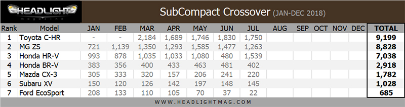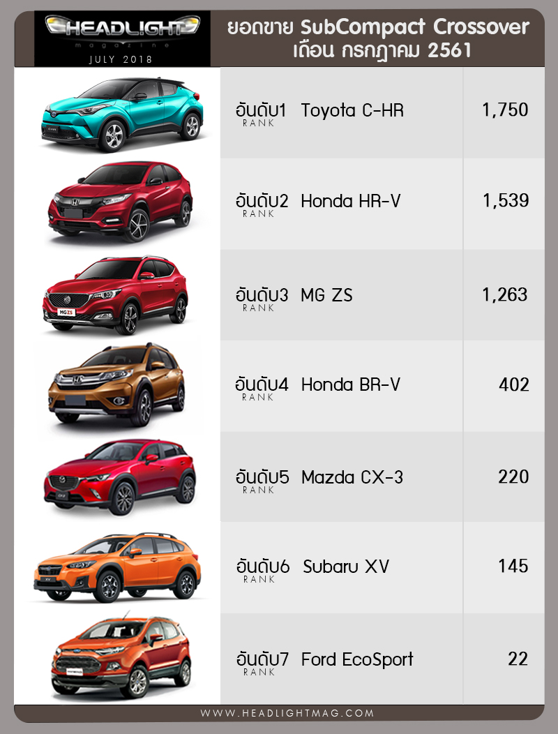 ยอดขายรถยนต์กลุ่ม SubCompact Crossover (B-SUV) เดือน กรกฎาคม 2561