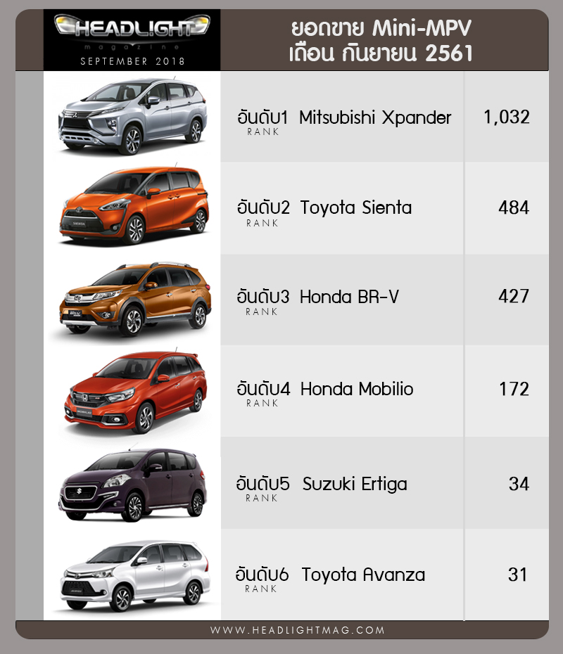 ยอดขายรถยนต์กลุ่ม Mini MPV เดือน กันยายน 2561