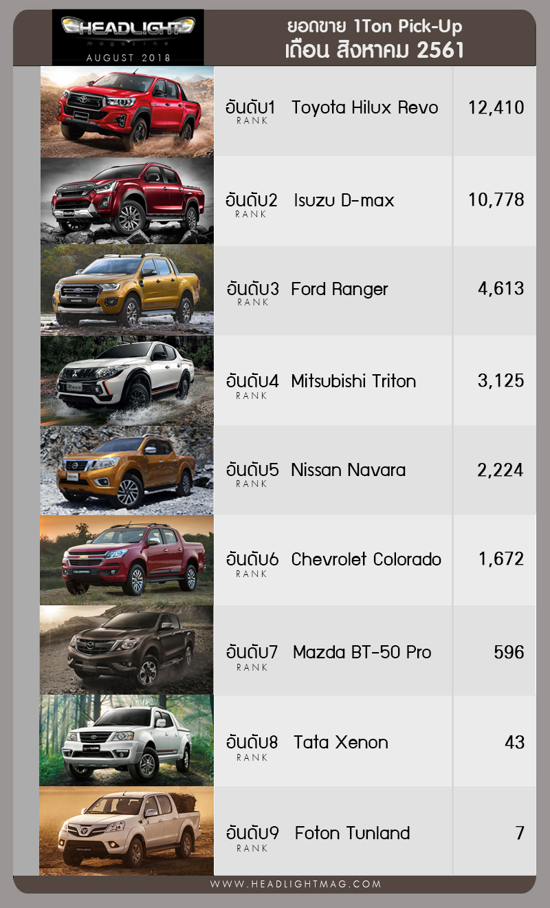 เป็นเดือนที่ 4 ติดต่อกันแล้ว ที่ Toyota สามารถทำยอดขาย Hilux Revo ขึ้นอันดับ 1 ทิ้งห่างอันดับ 2 อย่าง Isuzu D-max ราวๆ 1 พันกว่าคัน หลังจาก 5 เดือนแรกของปี 2018 รวมไปถึงปี 2017 ได้เสียแชมป์ให้กับ Isuzu D-max นอกจากนี้ยังมีการเสริมทัพ Revo Rocco เพิ่มเครื่องยนต์ 2.4 ลิตร เป็นทางเลือก, เพิ่มรุ่นเกียร์อัตโนมัติในอีกหลายๆรุ่น รวมไปถึงเปลี่ยนรุ่นตัวเตี้ยจากเดิมที่ใช้เกียร์ธรรมดา 5 จังหวะ เป็น เกียร์อัตโนมัติ 6 จังหวะ (ข้อมูลอ่านได้ที่นี่ >> Revo Rocco 2.4 / Revo Rocco 2.8 / Revo Single Cab MY2018)