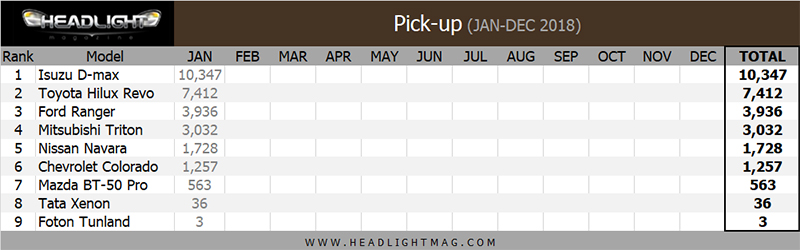 เปิดศักราชใหม่ ปี 2018 / 2561 Isuzu D-max ก็ยังคงมียอดขายอันดับ 1 ตามด้วยอันดับ 2 อย่าง Toyota Hilux Revo เช่นเคย แต่จุดที่น่าสนใจคือ อันดับ 3 อย่าง Ford Ranger มียอดขายที่เบียดขึ้นมา เกิน 50% หรือ เกินครึ่งหนึ่งของยอดขาย Toyota Hilux Revo เป็นครั้งแรก แม้จะไม่ใช่ยอดขายที่สูงที่สุดของ Ford Ranger แต่เมื่อเทียบกับสัดส่วน ถือว่าค่อนข้างสูง