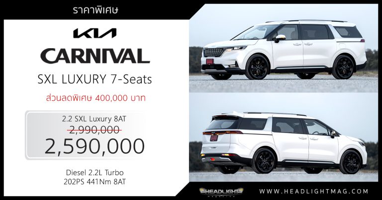 ราคาพิเศษ KIA Carnival SXL Luxury Carnival 2.2 SXL Luxu … อ่านเพิ่มเติม ราคาพิเศษ KIA Carnival SXL Luxury 7-Seats 2.2 8AT : 2,590,000 บาท | ส่วนลด 400,000 บาท