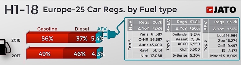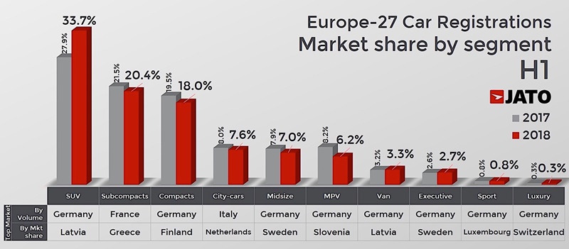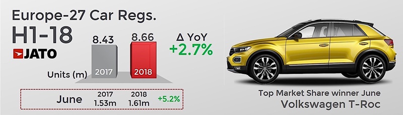ล่าสุด ก็มีการเปิดเผยข้อมูลยอดจดทะเบียนรถยนต์แต่ละประเภทในยุโรปประจำเดือนมกราคม – มิถุนายน 2018 จากสถิติพบว่า ยอดจดทะเบียนมวลรวมทั่วภูมิภาคยุโรปนั้นมีมากถึง 8.6 ล้านคัน เติบโต 2.7%