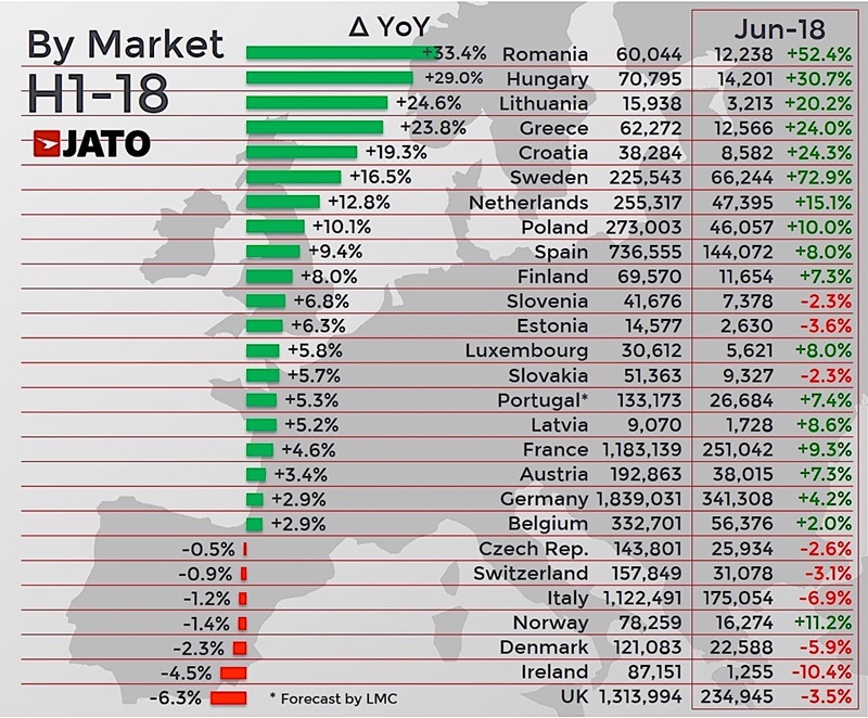 ถึงแม้ยอดจดทะเบียนรถยนต์ในยุโรปเติบโตสูงขึ้น แต่ประเทศอังกฤษ กลับมียอดขายรถยนต์ตกต่ำลง 6.3% เมื่อเทียบกับช่วงระยะเวลาเดียวกันในปี 2017 ในขณะที่ประเทศชั้นนำในยุโรปอย่าง ฝรั่งเศส, สเปนและเยอรมนี มียอดขายเติบโตสอดคล้องกับยอดขายรวมทั่วภูมิภาค นอกจากนี้ประเทศเนเธอร์แลนด์, โปแลนด์, สวีเดน, ฮังการี, กรีซ, โรมาเนีย, โครเอเทียและลิทัวเนีย ต่างก็มียอดขายเติบโตด้วยเช่นกัน