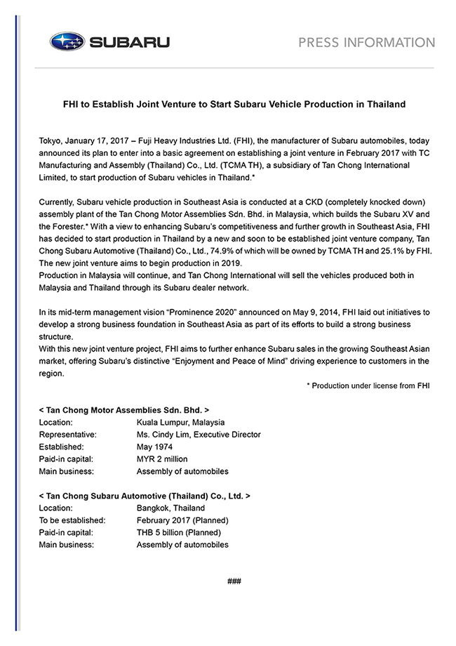 17 มกราคม 2017 FHI : Fuji Heavy Industry ตัดสินใจลงนามข้อตกลงร่วมกับกลุ่ม ตันจง กรุ๊ป เพื่อจัดตั้งบริษัท T.C.Manufacturing & Assembly (Thailand) หรือ TCMA TH เพื่อจะขึ้นสายการผลิตรถยนต์ Subaru ในประเทศไทย เม็ดเงินลงทุนกว่า 5,000 ล้านบาท