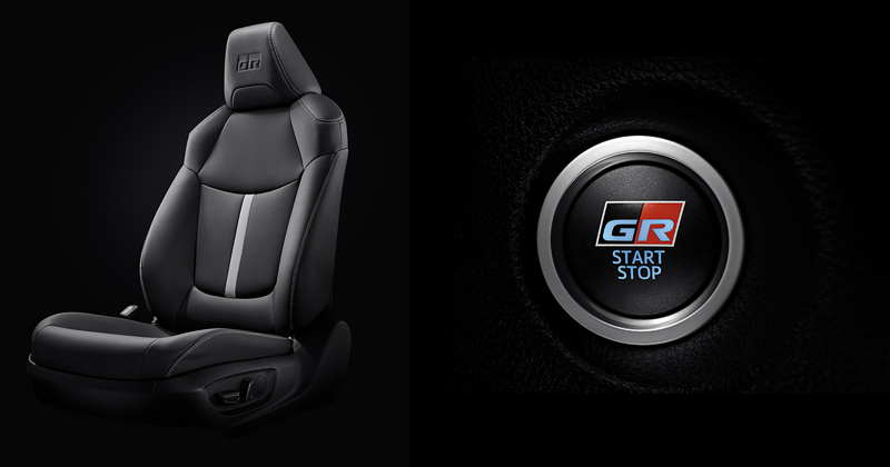 - เบาะนั่งหุ้มด้วยหนัง สีดำ ตกแต่งด้วยสีขาว พร้อมสัญลักษณ์ GR Sport